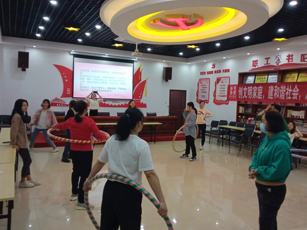 ? ? ?接下來是生動活沷的呼拉圈比賽,大家無論是有點基礎還是剛剛接觸,都全力以赴地投入到比賽中,歡聲笑語充滿整個會議室,熱火朝天的場面彰顯了女性的活力與自信!
