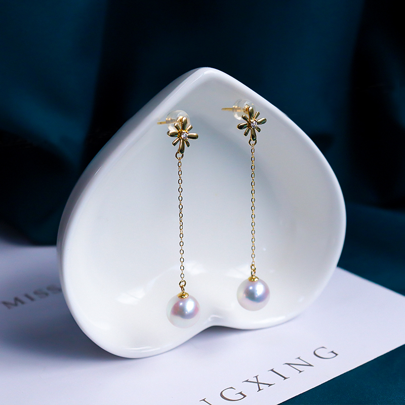 天然海水日本akoya珍珠耳線耳環(huán)女18k金長款正圓耳釘